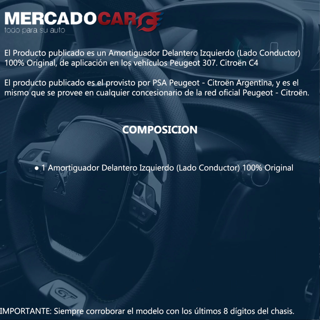El Producto publicado es un Amortiguador Delantero Izquierdo (Lado Conductor) 100% Original, de aplicación en los vehículos Peugeot 307. Citroën C4