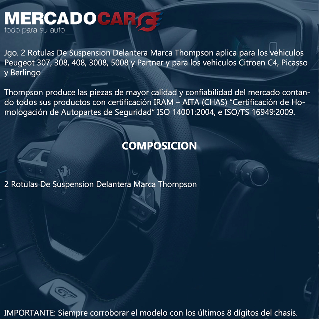Jgo. 2 Rotulas De Suspension Delantera Marca Thompson aplica para los vehiculos Peugeot 307, 308, 408, 3008, 5008 y para los vehiculos Citroen C4, Picasso