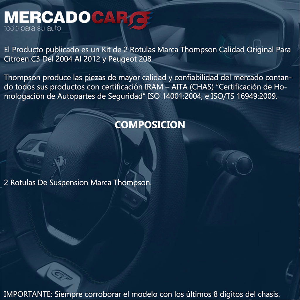 El Producto publicado es un Kit de 2 Rotulas Marca Thompson Calidad Original Para Citroen C3 Del 2004 Al 2012 y Peugeot 208
