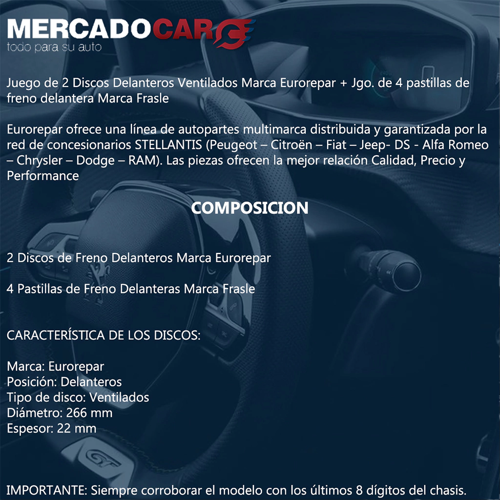 Juego de 2 Discos Delanteros Ventilados Marca Eurorepar + Jgo. de 4 pastillas de freno delantera Marca Frasle