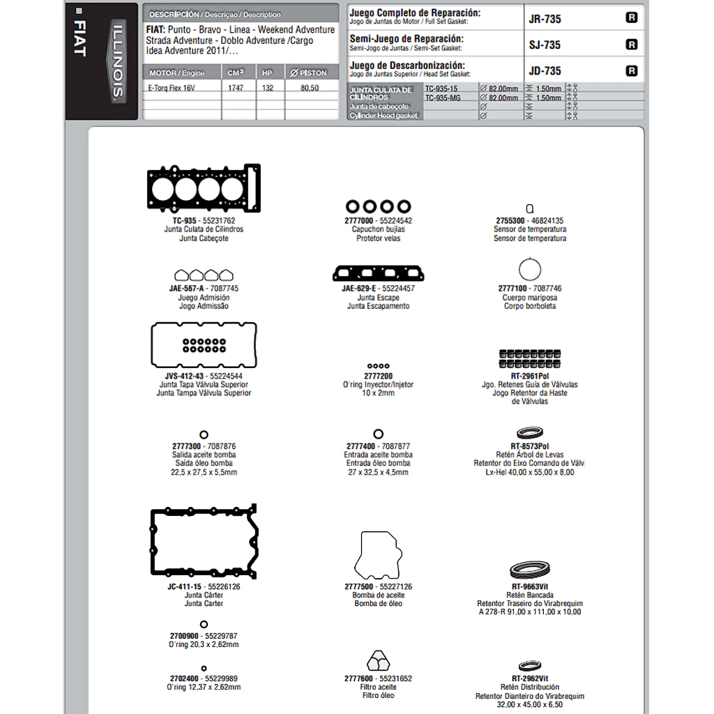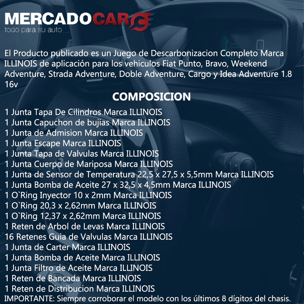 El Producto publicado es un Juego de Descarbonizacion Completo Marca ILLINOIS de aplicación para los vehiculos Fiat Punto, Bravo, Weekend Adventure, Strada Adventure, Doble Adventure, Cargo y Idea Adventure 1.8 16v