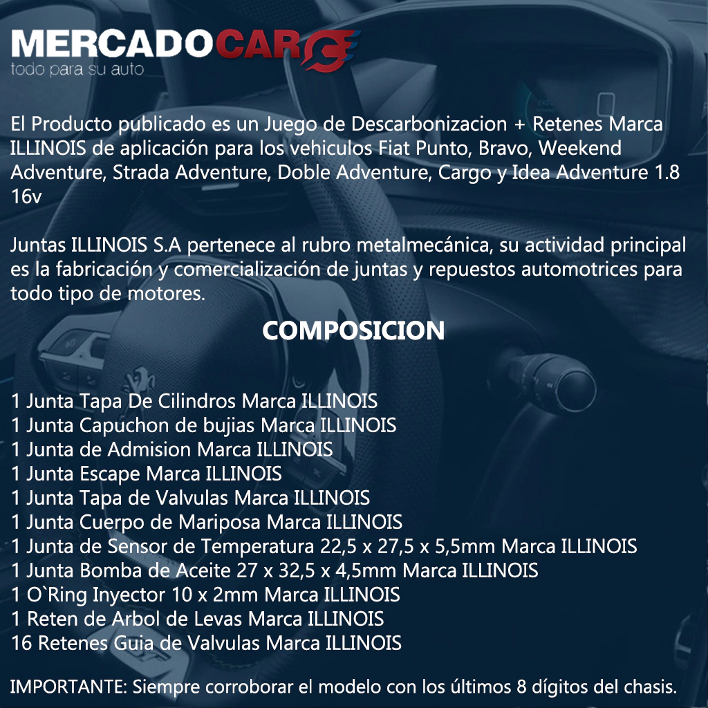 El Producto publicado es un Juego de Descarbonizacion + Retenes Marca ILLINOIS de aplicación para los vehiculos Fiat Punto, Bravo, Weekend Adventure, Strada Adventure, Doble Adventure, Cargo y Idea Adventure 1.8 16v
