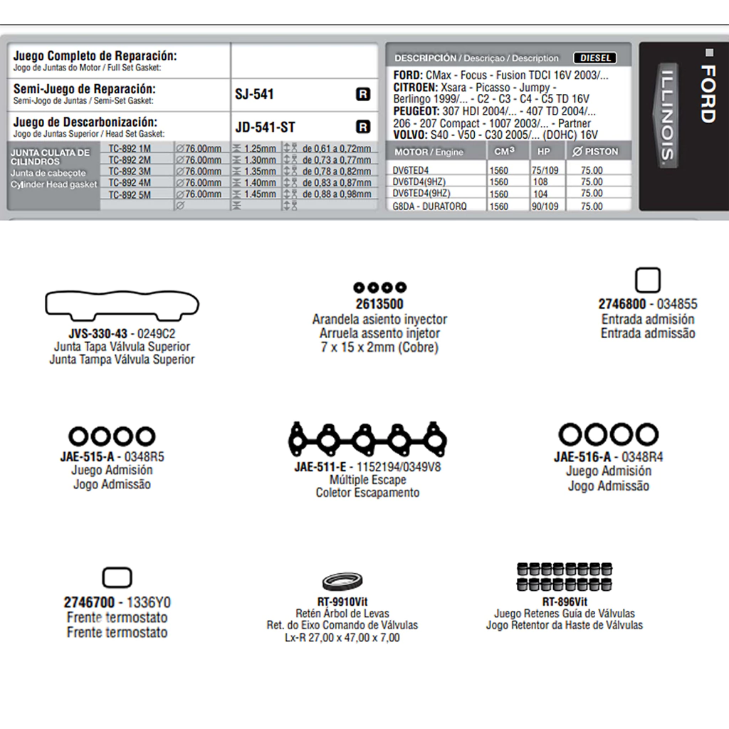 Juego Juntas Descarbonizacion Marca ILLINOIS de aplicación para los vehiculos Peugeot Partner, Expert y Citroen C4 Grand Picasso y Berlingo 1.6 16v HDI