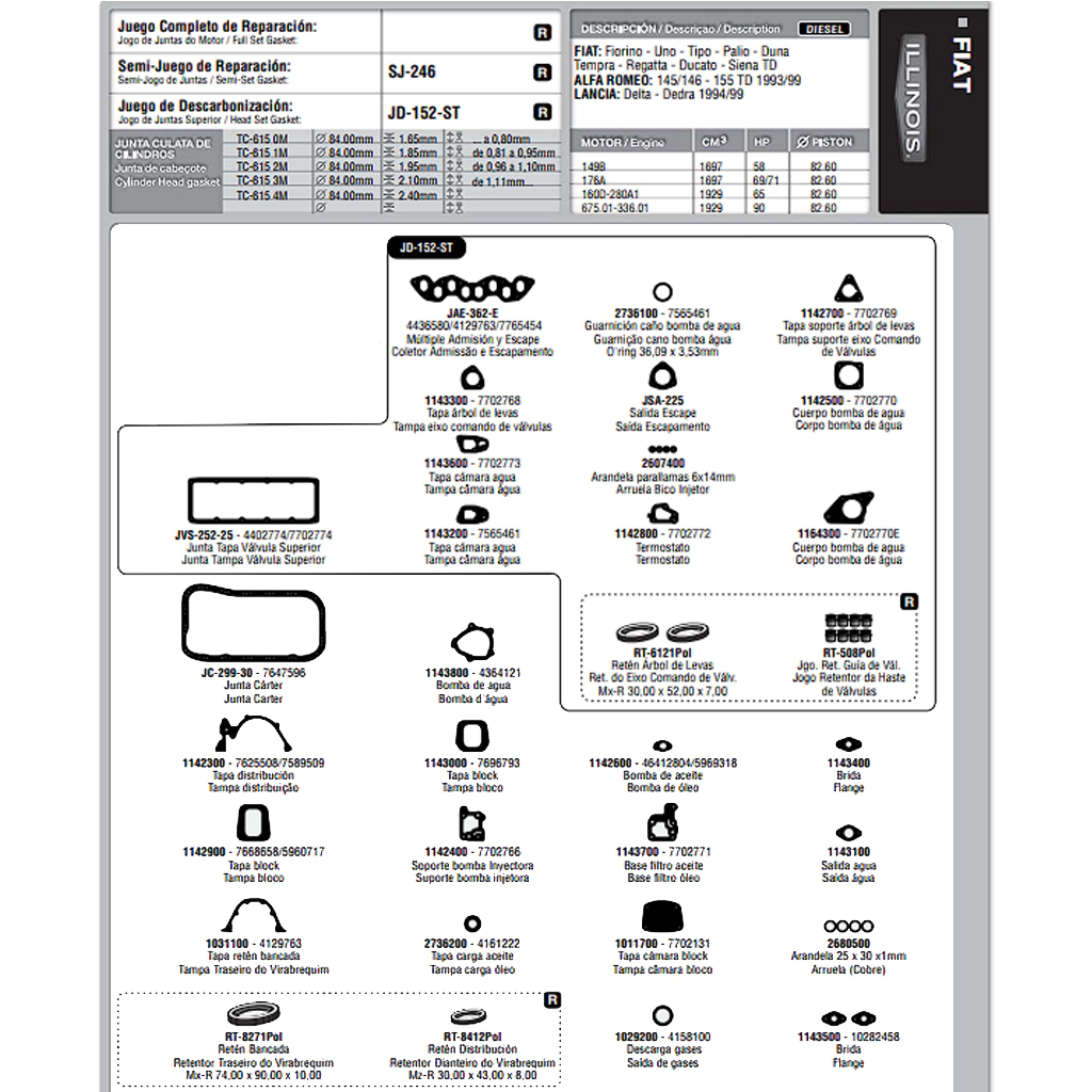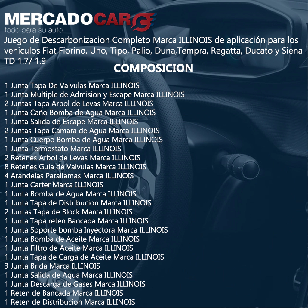 Juego de Descarbonizacion Completo Marca ILLINOIS de aplicación para los vehiculos Fiat Fiorino, Uno, Tipo, Palio, Duna,Tempra, Regatta, Ducato y Siena TD 1.7/ 1.9