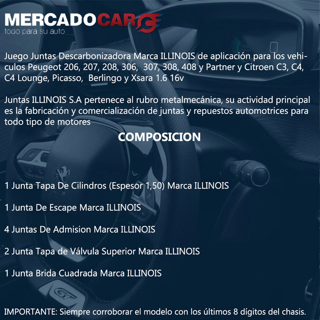 Juego Juntas Descarbonizadora Marca ILLINOIS de aplicación para los vehiculos Peugeot 206, 207, 208, 306, 307, 308, 408 y Partner y Citroen C3, C4, C4 Lounge, Picasso, Berlingo y Xsara 1.6 16v