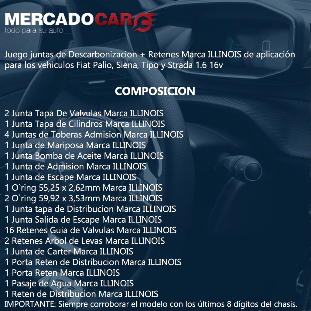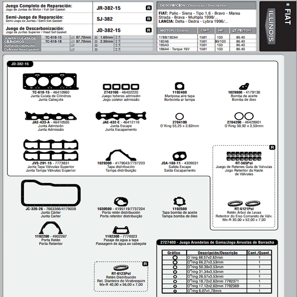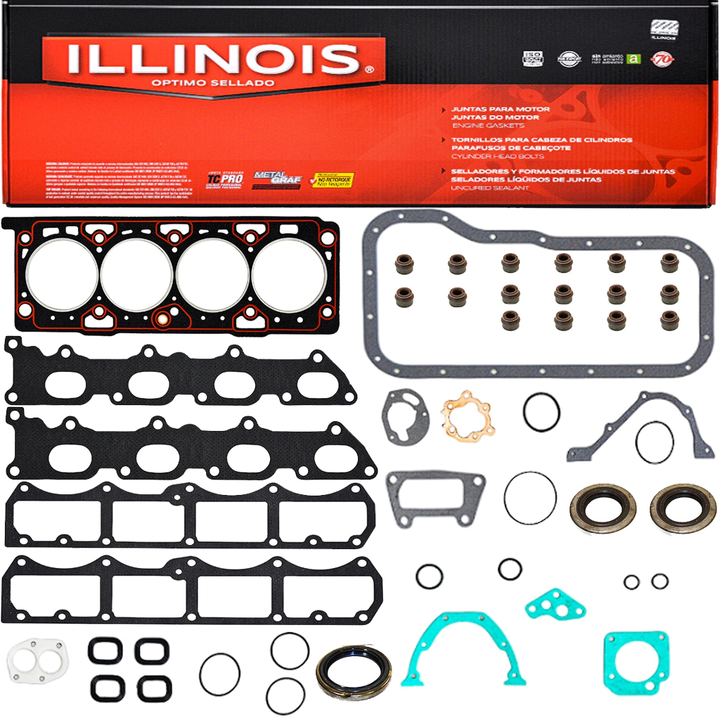 Juego juntas de Descarbonizacion + Retenes Marca ILLINOIS de aplicación para los vehiculos Fiat Palio, Siena, Tipo y Strada 1.6 16v