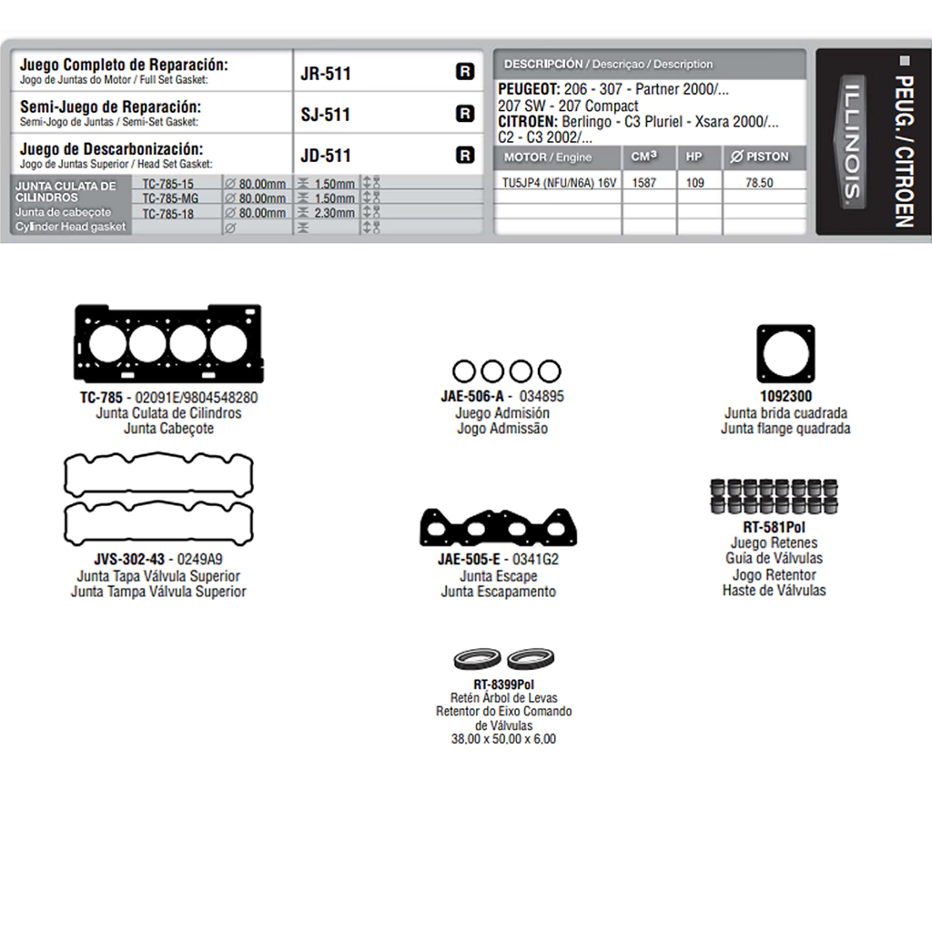 Juego Juntas Descarbonizacion Marca ILLINOIS de aplicación para los vehiculos Peugeot 206, 207, 307 y Partner y Citroen C3, Berlingo y Xsara 1.6 16v
