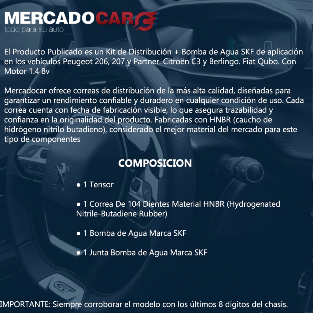 El Producto Publicado es un Kit de Distribución + Bomba de Agua SKF de aplicación en los vehículos Peugeot 206, 207 y Partner. Citroën C3 y Berlingo. Fiat Qubo. Con Motor 1.4 8v