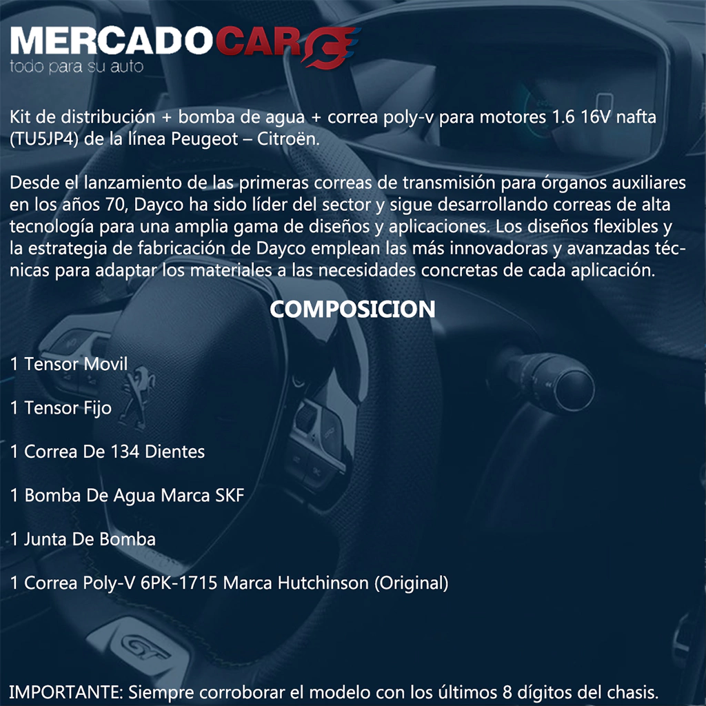 Kit de distribución + bomba de agua + correa poly-v para motores 1.6 16V nafta (TU5JP4) de la línea Peugeot – Citroën.