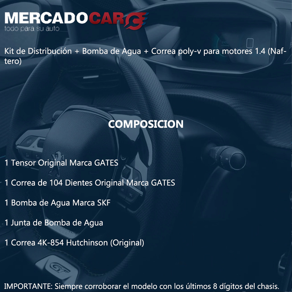 Kit de Distribución + Bomba de Agua + Correa poly-v para motores 1.4 (Naftero)