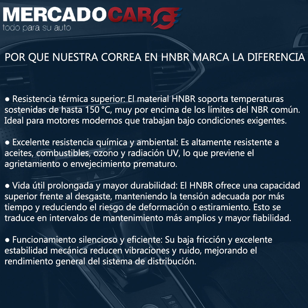 Mercadocar ofrece correas de distribución de la más alta calidad, diseñadas para garantizar un rendimiento confiable y duradero en cualquier condición de uso. Cada correa cuenta con fecha de fabricación visible, lo que asegura trazabilidad y confianza en la originalidad del producto. Fabricadas con HNBR (caucho de hidrógeno nitrilo butadieno), considerado el mejor material del mercado para este tipo de componentes