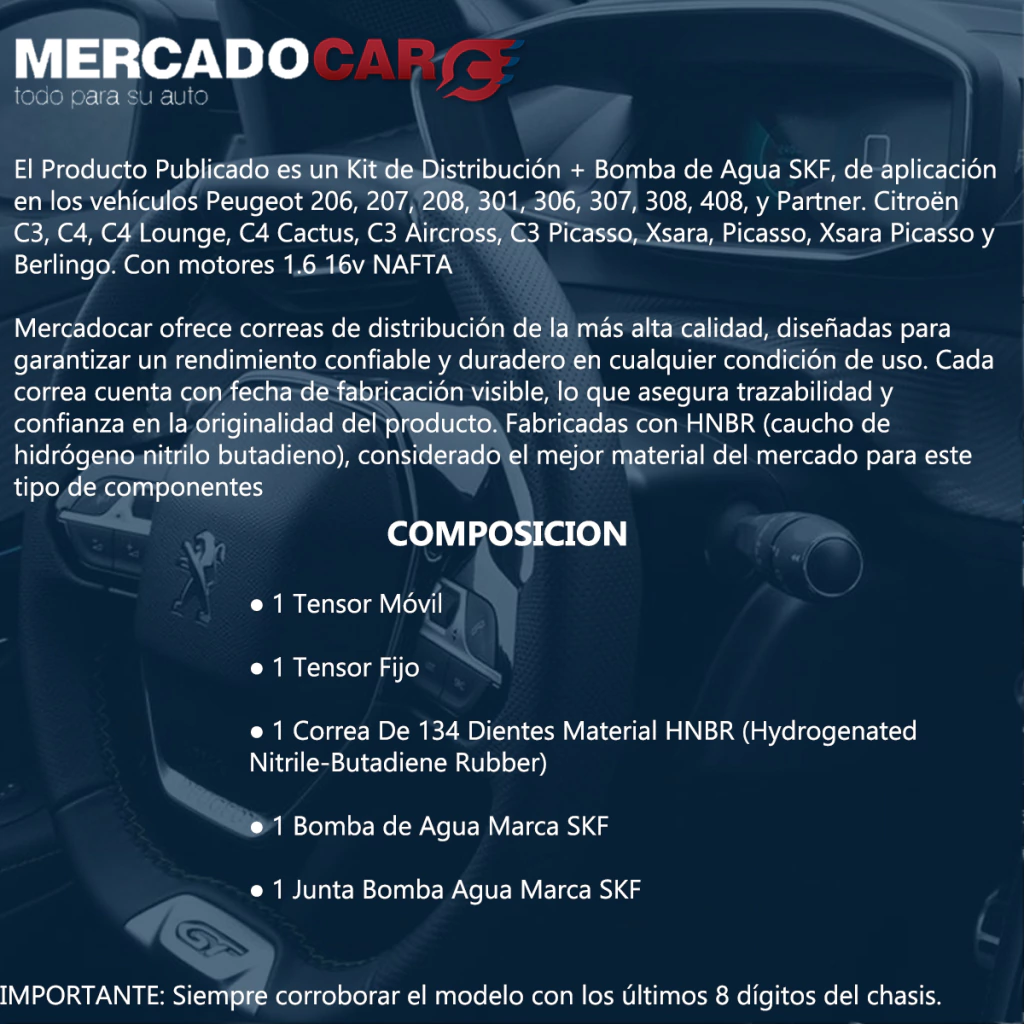 📦 El Producto Publicado es un Kit de Distribución + Bomba de Agua SKF, de aplicación en los vehículos Peugeot 206, 207, 208, 301, 306, 307, 308, 408, y Partner. Citroën C3, C4, C4 Lounge, C4 Cactus, C3 Aircross, C3 Picasso, Xsara, Picasso, Xsara Picasso y Berlingo. Con motores 1.6 16v NAFTA.