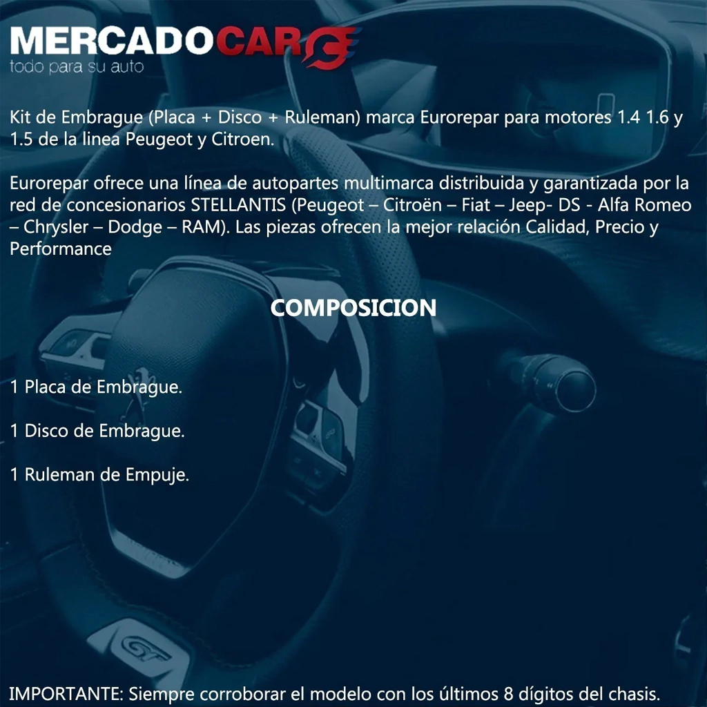 Kit de Embrague (Placa + Disco + Ruleman) marca Eurorepar para motores 1.4 1.6 y 1.5 de la linea Peugeot y Citroen.