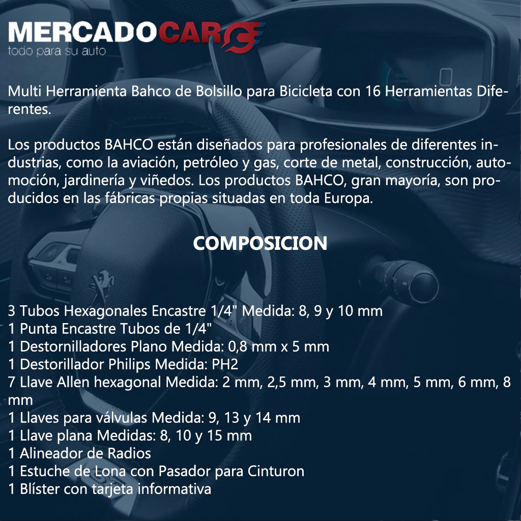 Multi Herramienta Bahco de Bolsillo para Bicicleta con 16 Herramientas Diferentes.